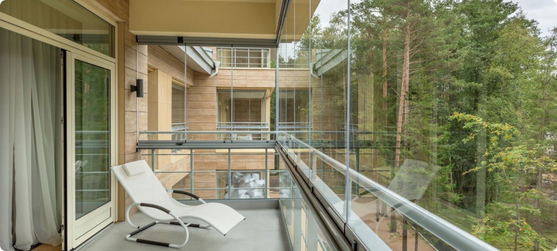 Технология, появившаяся в Финляндии, отличается отсутствием рам или перекладин. Она создает впечатление цельной стеклянной стены, что выглядит воздушно и легко, визуально расширяя пространство. Многие считают такое решение красивым, поэтому все больше компаний изготавливают, а также делают монтаж безрамного остекления.